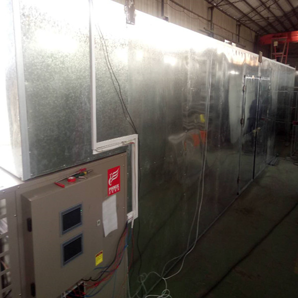河南輝宏機(jī)械農(nóng)產(chǎn)品烘干房采用電或燒煤、柴的熱風(fēng)爐為熱源,用軸流風(fēng)機(jī)、對(duì)熱交換器加熱物料,熱空氣流經(jīng)烘盤(pán)與物料進(jìn)行對(duì)流方式達(dá)到物料的烘干,大部分熱風(fēng)在烘干房均勻循環(huán),從而達(dá)成物料的干燥。