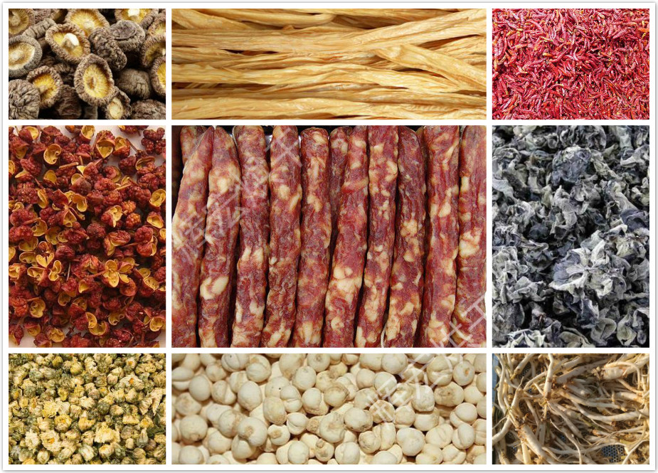 糧食谷物、海產(chǎn)品、蔬菜脫水、銀耳、地黃、瓜子、玫瑰花、花生、果蔬、腸衣、煙葉、皮革、香菇、枸杞、干果、金花葵、肉制品、蚊香、貢香、布料、衣物、掛面、腐竹、肥料、藥品、中藥材、紙品、木材、種子、污泥、石膏、五金產(chǎn)品、冶金產(chǎn)品、礦山副產(chǎn)品、化工產(chǎn)品、煙氣脫硫石膏、粘土、土豆、牧草、烤煙等的烘干。
